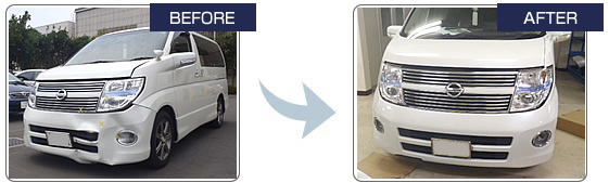 | 【日産 エルグランド】 | フロントバンパー・ヘッドライト 左フロントフェンダー 交換・鈑金 修理期間10~14日位 |